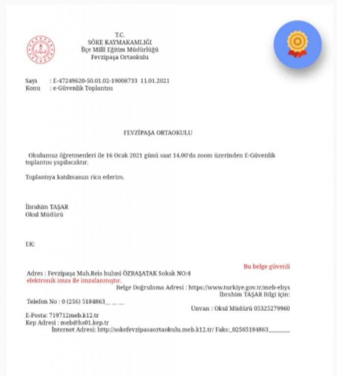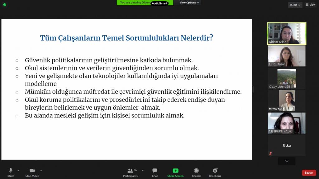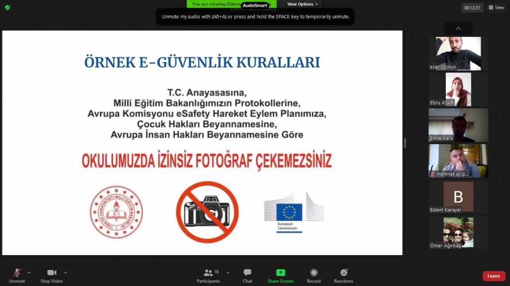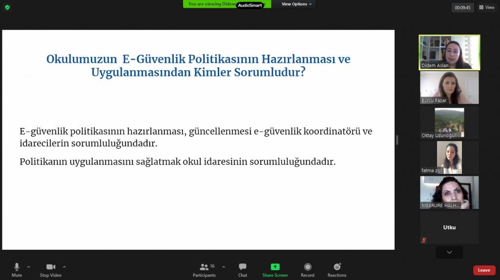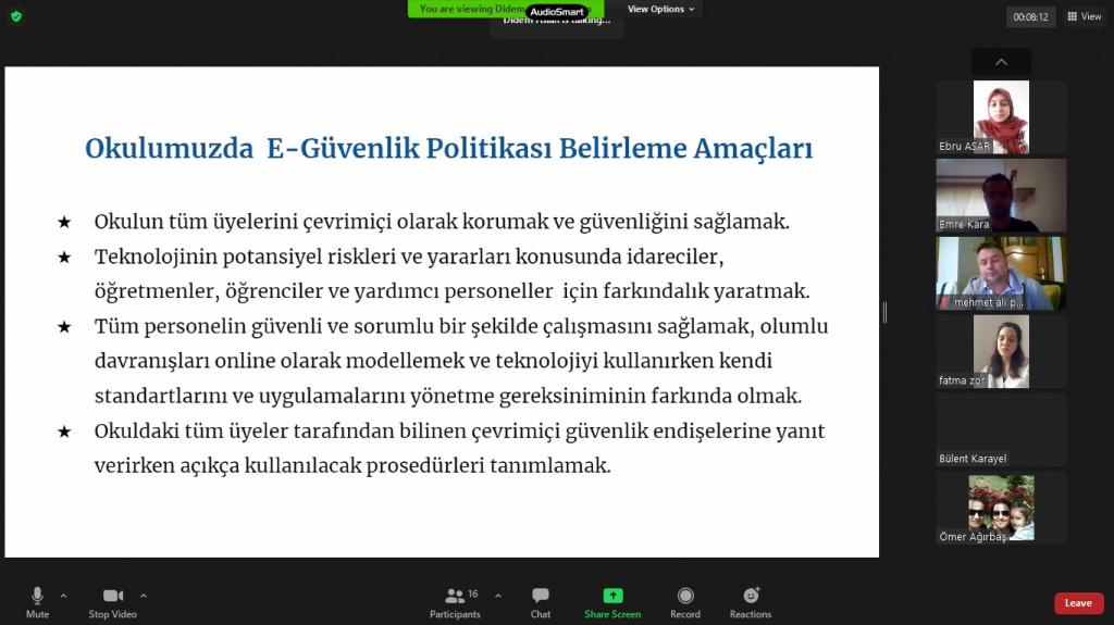 Okul Müdürü İbrahim TAŞAR'ın e-Güvenlik üzerine konuşmasıyla başlayan toplantıda Okullarda Sosyal Medyanın Kullanımı Genelgesi, e-Güvenlik ile ilgili yazı ve talimatlar öğretmenimiz Didem Arslan tarafından okundu. e-Güvenlik politikası oluşturuldu. Öğretmenlerimizin e-Güvenlik ile ilgili katılabilecekleri eTwinning platformundaki eğitimler hakkında öğretmenimiz Pınar Ünlü Aşık tarafından bilgi verildi. Okulumuzun çevrimiçi güvenlik alt yapısını, politikalarını ve uygulamalarını ulusal ve uluslararası standartlara ulaştırmak ve daha da güvenli bir okul olmak için eSafety çalışmaları yürütülmekte olduğu belirtildi.